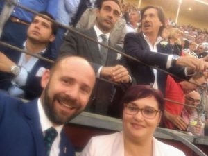 y coordinador Nacho Lloret quién ofreció un trato realmente de máxima preferencia. Nacho tiene referencias directas del Festival de La Unión porque su padre, gran aficionado al flamenco, asistió en distintas ocasiones. El joven ejecutivo está interesado en conocer este año el Festival, y a buen seguro que estará en La Unión. La atención de Nacho Lloret fue inmediata, con el mayor agrado, y desde luego, las dos localidades que ocuparon la Primer Tte. Alcalde de La Unión –Elena José Lozano- y el Jefe de Protocolo y Coordinación del Festival -Juan Carlos López, lo dicen todo. Sendos pases de callejón para dos burladeros de tendido de sombra, donde, precisamente, en barrera estaba detrás de ellos el «Castillete de Oro»: Maestro Enrique Ponce, a quién saludaron. Recordó el Maestro con cariño su paso por La Unión.
