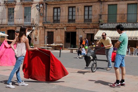 El sábado los capotes y muletas volvieron a llenar de color y torería la Plaza de España de Sepúlveda. La Asociación de Aficionados Prácticos Taurinos “Víctor Barrio” organizó una actividad de toreo de salón en la calle en recuerdo a quien tantos ratos pasó con ellos transmitiéndoles la pasión por el mundo del toro. En ella participaron personas de todas las edades: muchos niños (muestra de la semilla que Víctor Barrio sembró), pero también adultos e, incluso, turistas que tuvieron su primer contacto con la tauromaquia. El novillero Daniel Menés, amigo personal de Barrio, acompañó en este acto a los aficionados sepulvedanos enseñando a coger los trastos y a moverlos con profesionalidad a todos cuantos se congregaron allí.