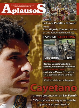 El número 2.075 de APLAUSOS ya está en los quioscos. El semanario taurino trae consigo un completo y amplio especial dedicado a la Feria de San Fermín de Pamplona. A lo largo de 22 páginas, toman la palabra los protagonistas del abono en la capital navarra. Uno de ellos, Cayetano Rivera Ordóñez, es quien protagoniza la entrevista de la semana. En ella afirma, entre otras muchas cosas: «Lo que siempre me ha tenido intranquilo es cómo encajaría el bullicio de la plaza mientras toreo… Ahora ya no habrá que esperar mucho para saberlo». Y añade: «De los toros siempre me han preocupado más sus ideas que su tamaño. Además, cuando uno va a plazas de este calibre es consciente de la seriedad del animal que allí se lidia».