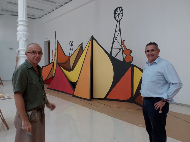 El pintor ha trabajo en una sala rehabilitada del edificio de la Casa del Piñón que en un futuro acogerá el archivo municipal. Allí, Esteban Bernal ha encontrado la inspiración acompañado de la música clásica y de su maestro “Asensio ha estado pintando conmigo”, igual que lo acompañaba, ha explicado, cuando de niño era su maestro de plástica.
