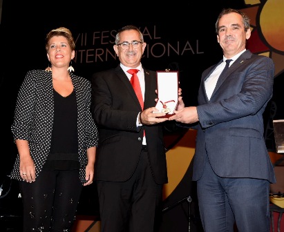LA UNIÓN. (Murcia). Sábado, 12 de agosto 2017. REDACCIÓN.- (Fuente: Prensa-FICM) -Teniendo por marco la Catedral del Cante, que registró un nuevo lleno, antes de comenzar la Gala de Clausura de esta 57 Edición del Festival del Cante de Las Minas, el alcalde de La Unión y presidente ejecutivo de la Fundación Cante de las Minas, Pedro López Milán, acompañado de la consejera de Transparencia, Participación y portavoz del Gobierno regional, Noelia Arroyo, ha entregado el máximo Galardón Institucional, Premio »Castillete de Oro» al viceconsejero de Cultura y Deporte del Principado de Asturias Vicente Domínguez.