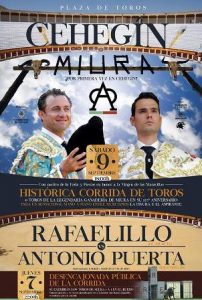 Por primera vez en sus 175 años de historia la legendaria ganadería de MIURA lidiará una corrida de toros en Cehegín en un llamativo mano a mano que se disputarán todo un especialista en este hierro como es el gran RAFAELILLO, que lleva matadas 52 corridas de éste hierro y sin embargo ésta será esta la primera que mate en la Región de Murcia. Le acompañará en el cartel nuestro paisano ANTONIO PUERTA que ha decidido realizar esta gran gesta ante sus paisanos, los cuáles seguro estarán con él y se lo agradecerán.