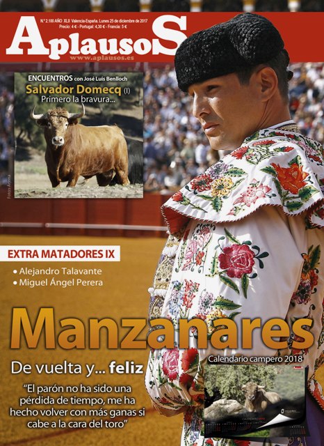 El número 2.100 de APLAUSOS ya está en los quioscos y con el mismo, el tradicional «Calendario campero 2018» de regalo con el que la revista felicita a sus lectores. Además, José María Manzanares protagoniza la portada del ejemplar así como una extensa entrevista en páginas interiores en la que, entre otras cosas, afirma: “Los parones te hacen volver con más ganas si cabe a la cara del toro. Este no ha sido una pérdida de tiempo. Me ha hecho mucho bien”. Y añade: “Lo más difícil en el toreo es conseguir que el toro embista a la velocidad que quieres, sobre todo si esa velocidad que buscas es baja. Yo quiero ahondar en ese concepto”.
