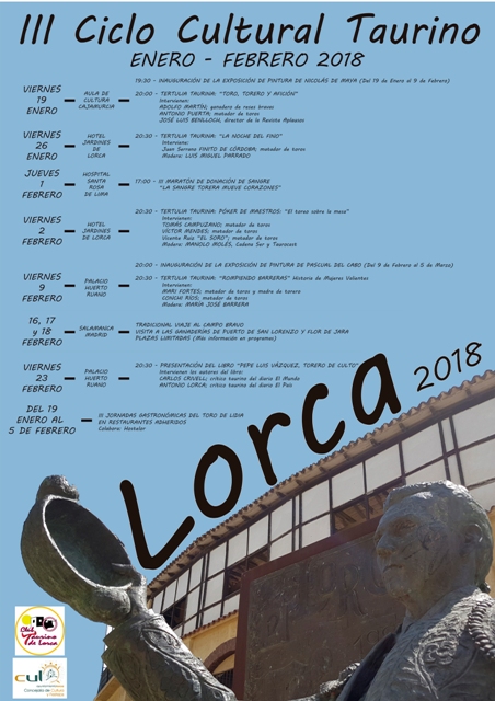 – Viernes 2 de Febrero en Hotel Jardines de Lorca, a las 20:30 horas. “Póker de maestros” Cuatro maestros del toreo se juntan para hablar de la situación actual de la fiesta de los toros. Tomás Campuzano, Víctor Mendes, Vicente Ruiz “El Soro” y Manolo Molés disertaran sobre el pasado, presente y futuro del toreo.