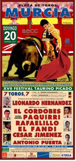 PUBLICADO EN www.LAVERDAD.es Por PACO OJADOS. El centenario coso abre sus puertas por primera vez esta temporada para acoger un festival taurino con picadores que ya es un referente social para toda la Región y cuyos beneficios sirven para oxigenar las arcas de la Asociación Española de la Lucha Contra el Cáncer de Murcia. El festival cumple este año su decimoséptima edición, y desde sus principios hasta hoy ha sido un ejemplo de la sensibilidad que la sociedad murciana tiene para apoyar causas justas y que benefician a todos, como es la labor de una Asociación como la de la lucha contra el cáncer. En este festival los tendidos de la plaza se pueblan de aficionados y público en general que acude una vez al año a los toros, y lo hace por dos razones, una la de apoyar la causa benéfica, la otra disfrutar de una agradable tarde de toros, en la que se anuncian los toreros de más nombre del momento.