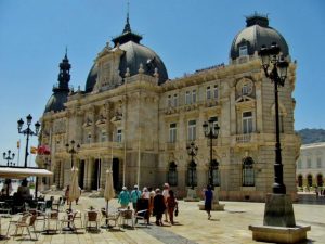 PALACIO CONSISTORIAL.- Es uno de los referentes de la arquitectura modernista y ecléctica de Cartagena. Construido con mármoles de gran calidad y granito, tanto en su fachada como en el interior de la recepción. Este palacio (Sede del Excmo. Ayuntamiento) sorprende por la riqueza de sus acabados, sus vidrieras, tapices y formas. También destaca por las columnas de hierro fundido y las escamas de zinc de los exteriores de sus cúpulas.