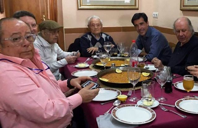 TNM. En la foto del archivo personal de nuestro amigo Conrado Abellán, un inolvidable reciente recuerdo de un encuentro entre amigos en Murcia, donde está al fondo con gorrila Paco Arévalo, su hijo el cómico Arévalo en primer plano, a su lado Eduardo Osca, a la izquierda el matador de toros Javier Vázquez y el taurófilo Antonio Fuentes, preside la mesa el entrañable Canito.