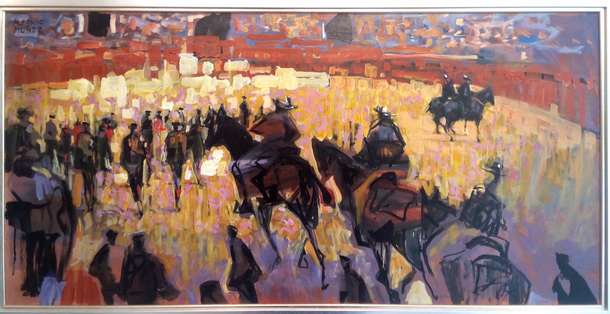 sólido, ágil, preciso, y de una pincelada amplia y constructiva. Y la riqueza cromática, en función de una luminosidad mediterránea, es ingente, atractiva y vibrante, cristalina. Los pinceles de Alfonso captan la lírica fugaz y eterna -de un instante y de una imagen- del alma del tiempo y del espacio: en el color, en el movimiento, en la luz. En el movimiento se percibe una exquisita estabilidad entre el equilibrio y el desequilibrio; también seriedad, voluptuosidad, ritmo y pasión en un lance o en la ejecución airosa de un par de banderillas.