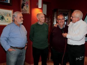 acordes de pasodobles muy toreros; tras el suculento aperitivo de recepción, especialmente para lo ocasión, se degustó un excelente, variado y exquisito menú preparado con sumo cuidado de presentación y elaboración. A los postres recibimos sorpresivamente la muy grata visita del propio Manolo Juárez, con quien tuvimos la oportunidad de departir y donde junto con el torero alicantino Emilio García “El Lince”, que nos acompaño en este viaje junto a su familia, rememorando en improvisada tertulia numerosas anécdotas vividas por ambos que hicieron revivir entrañables y románticas épocas pasadas del toreo en esta región de Murcia, y de la que ellos fueron directos protagonistas. Tras el café hubo un brindis especial, y para quién lo deseo la barra era libre.