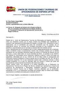 MURCIA. Lunes, 11 de marzo de 2019.- REDACCION.- El empresario y apoderado Luis Sánchez Pacheco »GUERRITA», nos facilita el escrito que la Unión de Federaciones Taurinas de España – UFTAE- remite con fecha de ayer domingo, 10/03/2019, expresando enérgica protesta al Alcalde de La Unión, Pedro López Milán, ante el comunicado del Ayuntamiento de prohibición de la novillada programada para el próximo 31 de marzo en el municipio.