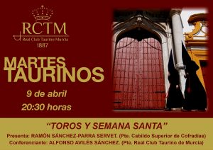 Mañana martes 9 de abril, el presidente de la entidad, Alfonso Avilés, pronunciará una conferencia titulada: “Toros y la Semana Santa”. Presentará el acto el presidente del Cabildo Superior de Cofradías de Murcia, Ramón Sánchez-Parra Servet.