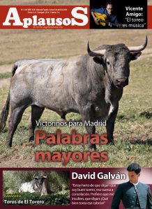 El número 2.167 de APLAUSOS ya está en los quioscos. Un toro de Victorino Martín protagoniza la primera página del número con motivo de su presencia en la corrida del Domingo de Ramos en Madrid. En páginas interiores se pueden ver las fotos de los toros reseñados, así como una valoración del propio ganadero. “La corrida es seria pero con el tipo de nuestra ganadería. De cara hay toros muy ofensivos y otros más bonitos pero todos con ese punto de seriedad que exige la plaza de Madrid que tan bien conocemos”.