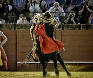 Cristóbal Ramos ‘Parrita’ no pudo lucir con el capote porque el segundo novillo salió suelto de las suertes. También manseó en el caballo, derribando de forma espectacular al picador que hacía puerta y propinó un susto al banderillero Pedro J. Mariscal a la salida de un par. Parrita brindó a Octavio Mulet, cirujano jefe de la plaza, pero el de Soto de la Fuente llegó imposible a la muleta por manso, parado y a la defensiva. Tanto es así que le propinó una fea voltereta al entrar a matar de la que por fortuna salió ileso. Se eternizó con el descabello y escuchó dos avisos.