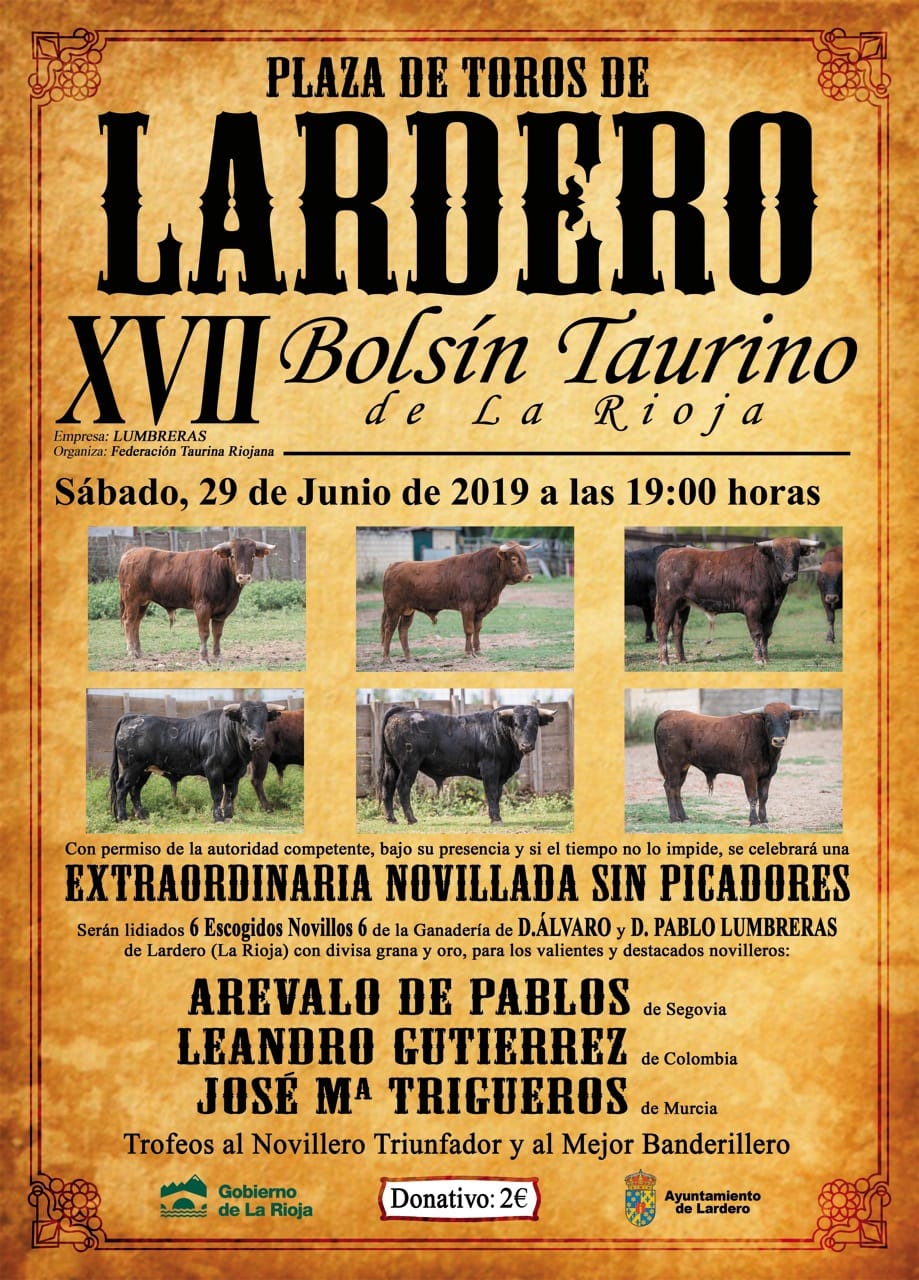 SABADO, 15 de junio de 2019. REDACCION.- El pasado 22 de mayo se conocieron los finalistas de la XVII Edición del Bolsín Taurino de la Rioja – Arevalo de Pablos, de Segovia, Leandro Gutierrez, de Colombia, y José Maria Trigueros, de Murcia, lidiarán seis novillos de D. Alvaro y D. Pablo Lumbreras; hoy, la Federación Taurina Riojana ha dado a conocer la fecha y lugar de celebración de la final, será en la Plaza de Toros de Lardero, el próximo sábado 29 de junio, a las 7 de la tarde.