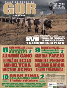 GOR (Granada). Miercoles, 24 de julio de 2019. REDACCION.- Fiestas en Honor de San Cayetano – Ya se conocen los carteles de la XVII Edición del Certamen de novilladas sin picadores Trofeo »La Almendra de Plata» de la localidad granadina de Gor.