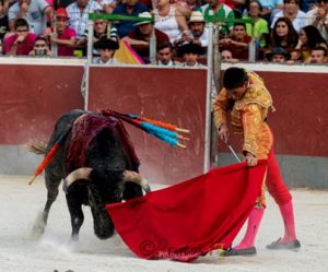 BLANCA (Murcia). Jueves, 15 de agosto de 2019. – Tercera y última novillada de la Feria de San Roque – Informa: JESÚS CANO MELGAREJO. Fotos: FRUTOS MOLINA. José Cabrera quiere ser torero a corto plazo. El novillero almeriense dejó huella entre los aficionados más exigentes, exponiendo muchísimo ante un lote muy exigente de Saltillo. Su salida en hombros de la plaza junto al rejoneador Óscar Mota fue muy meritoria. Mató con mucha seguridad y acierto.