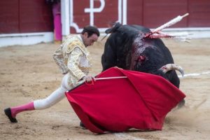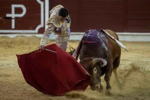Mejor estuvo Perera, si cabe, en la faena al quinto. Brindó de nuevo al público y comenzó toreando en redondo con las dos rodillas en tierra, sufriendo una fea voltereta. Volvió a la cara y siguió toreando de rodillas, enardeciendo al público. Ya de pie dio dimensión de gran figura, ligado series muy ligadas y de total dominio. El final de faena fue de valor metido entre los pitones. Mató bien y cortó otras dos orejas de ley.