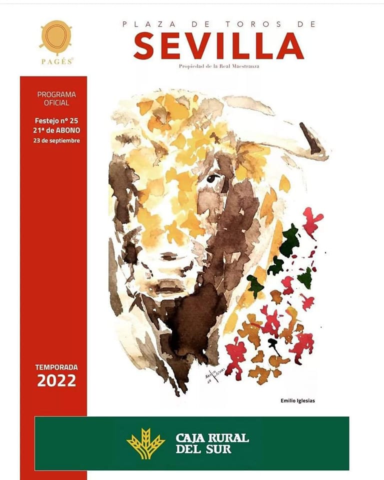 SEVILLA. Viernes, 23/septm./2022. REDACCIÓN.- (Fuente: TOROMEDIA). El programa de mano de hoy en la Real Maestranza ilustrado por una original y bonita pintura del gran artista murciano EMILIO IGLESIAS -Directivo del Real Club Taurino de Murcia-
