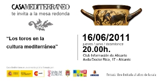 REDACCION. SÁBADO, 11 JUNIO 2011. El próximo jueves la Casa del Mediterráneo ha organizado, coincidiendo con el inicio de la Feria de las Hogueras de San Juan, siguiendo la iniciativa de José María Jericó, presidente de la Tertulia Taurina “Amigos de Nimes” y colaborador en distintos medios de comunicación taurina, una Mesa Redonda con el tema “Los toros en la cultura mediterránea”. El acto con entrada libre hasta completar el aforo del local, se celebrará en el Club Información de Alicante, sita en la calle Doctor Rico, 17, el día, 16, a las 20,00 horas.