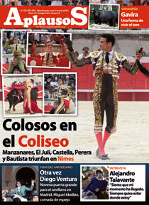 Las ferias de Pentecostés de Nimes y del Aniversario de Madrid copan gran parte de los contenidos de la revista APLAUSOS de esta semana. El semanario se centra especialmente en los éxitos obtenidos en el coliseo francés por Manzanares, El Juli, Juan Bautista, Sebastián Castella, Luis Bolívar y Miguel Ángel Perera y en Las Ventas por el rejoneador Diego Ventura, en un ciclo en el que fue herido de gravedad Miguel Abellán. Además, ofrece información crónica y gráfica de todo cuanto ha acontecido en las plazas de Vic-Fezensac, Getafe, Albacete y Salamanca.