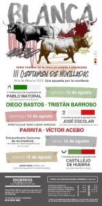La feria de Blanca se desarrollará los días 11, 12, 13 y 15 de agosto y estará compuesta por dos novilladas clasificatorias más la final, además de un Concurso de Recortadores que se celebrará el día 14.
