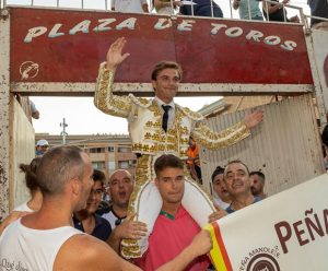 BLANCA (Murcia). Domingo, 13/agosto/2023. Informa: TOROMEDIA COMUNICACION. Foto salida a hombros: SACRIS/EL MULETAZO. El novillero murciano Víctor Acebo fue el triunfador de la segunda novillada clasificatoria de la Feria de San Roque de Blanca al cortar un total de tres orejas. Acebo hizo lo más destacado en la novillada de Escolar, que apenas dio opciones al otro murciano del cartel, Parrita, que se fue de vacío.