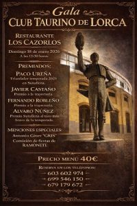 LORCA (Murcia). Martes 30 de diciembre de 2025 – Prensa-C.T.L. – El Club Taurino de Lorca celebrará el próximo domingo 18 de enero de 2026 su tradicional Gala Anual, un encuentro que reunirá a aficionados, profesionales y amigos de la tauromaquia para rendir homenaje a los protagonistas más destacados de la temporada.