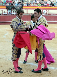 MONÓVAR (Alicante). Viernes, 9 Setm. 2011. Por JOSÉ Mª. JERICÓ. Fotos.- BENITO S. LEYVA. Tarde de emociones y sentimientos para el toricantano Iván Pérez que por fin veía como su sueño de convertirse en matador de toros se cumplía. Para este día el ganadero de Guadalmena envío a la “Joya del Vinalopo” una pareja y bien presentada corrida de toros, que además dieron un excelente juego en el ruedo aunque pecaron de falta de fuerzas. Juan José Padilla se erigió en el triunfador de la tarde al cortar cuatro orejas, conseguidas en dos faenas en las que llego mucho al público con sus formas y maneras. Esta claro que este torero es un gran psicólogo y tiene un don, el de meterse en el bolsillo a los espectadores que acuden a verlo. Hizo de todo, entablo un diálogo con la banda de música, jaleó al publico e incluso enjaretó en algunos momentos excelentes muletazos sobre ambas manos. El pacense Antonio Ferrera puso empeño en hacer buen toreo y a fe que lo logro en algunos momentos, sobre todo en el toreo al natural. Mató defectuosamente a sus dos toros y se tuvo que conformar con un apéndice de cada uno. Compartieron banderillas Padilla y Ferrera en los primeros toros de sus lotes y banderillearon en solitario a