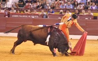 MURCIA. 1ª. De Feria. -Novilla con Picadores- Domingo, 11 Septiembre 2011. Texto y Fotos.- PEPE CASTILLO ABREU. La cartel tenía especial interés para la afición murciana al tratarse de tres novilleros de la tierra que llevan una buena temporada y que atraviesan un excelente momento: MONTIEL, RÁOS Y PUERTA. Pero los novillos de José Luís Marca no dieron opciones para los deseos de triunfo de los tres murcianos ante sus paisanos. Por actitud y esfuerzo toda la tarde destacó un ANTONIO PUERTA, al que se le vio muy firme, templado, variado y con las ideas muy claras. En ambos toros dejó claras cuales eran sus intenciones, al irse a porta-gayola, largas cambiadas, verónicas, tafalleras y bonitos remates de salida. Con la muleta tuvo buenos momentos, mejor en el violento “saltamontes” que cerró plaza, que daba derrotes y salía muy rebrincado y con peligro. A este, tras brindar al público, lo recibió en el centro del ruedocon dos pases cambiados por la espalda. Cerró con ajustadas manoletinas. Puso el de Cehegín mucha, excesiva, voluntad ante un