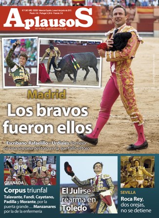 LUNES, 8 Junio 2015. Remitido.- Redacción de APLAUSOS.es El número 1.967 de APLAUSOS ya está en los kioskos. Rafaelillo protagoniza la primera página de un número que da amplia cobertura crónica y gráficamente de la última semana de la Feria de San Isidro de Madrid así como a la Feria del Corpus de Granada y los festejos celebrados en Sevilla o Toledo.