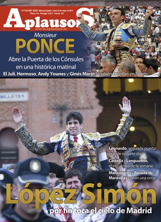 El número 1.965 de la Revista APLAUSOS ya está en los kioskos. Alberto López Simón, tras abrir la puerta grande de Las Ventas, y Enrique Ponce, después de su histórica matinal en el Coliseo de Nimes, protagonizan la portada del ejemplar. Junto a estos dos acontecimientos, se analiza todo lo acontecido en la última semana en la Feria de San Isidro, en la Feria de Pentecostés de Nimes y en la de Vic-Fezensac.