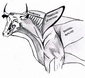 Figura 2. Músculos Trapecio y Romboides, extensores de la cabeza del toro (al levantar el Trapecio, debajo se observa el Romboides).
