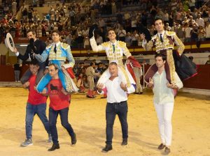 Dimensión de figura de Roca Rey y proyección de Caballero en un festejo triunfal con los toreros y el ganadero en hombros.