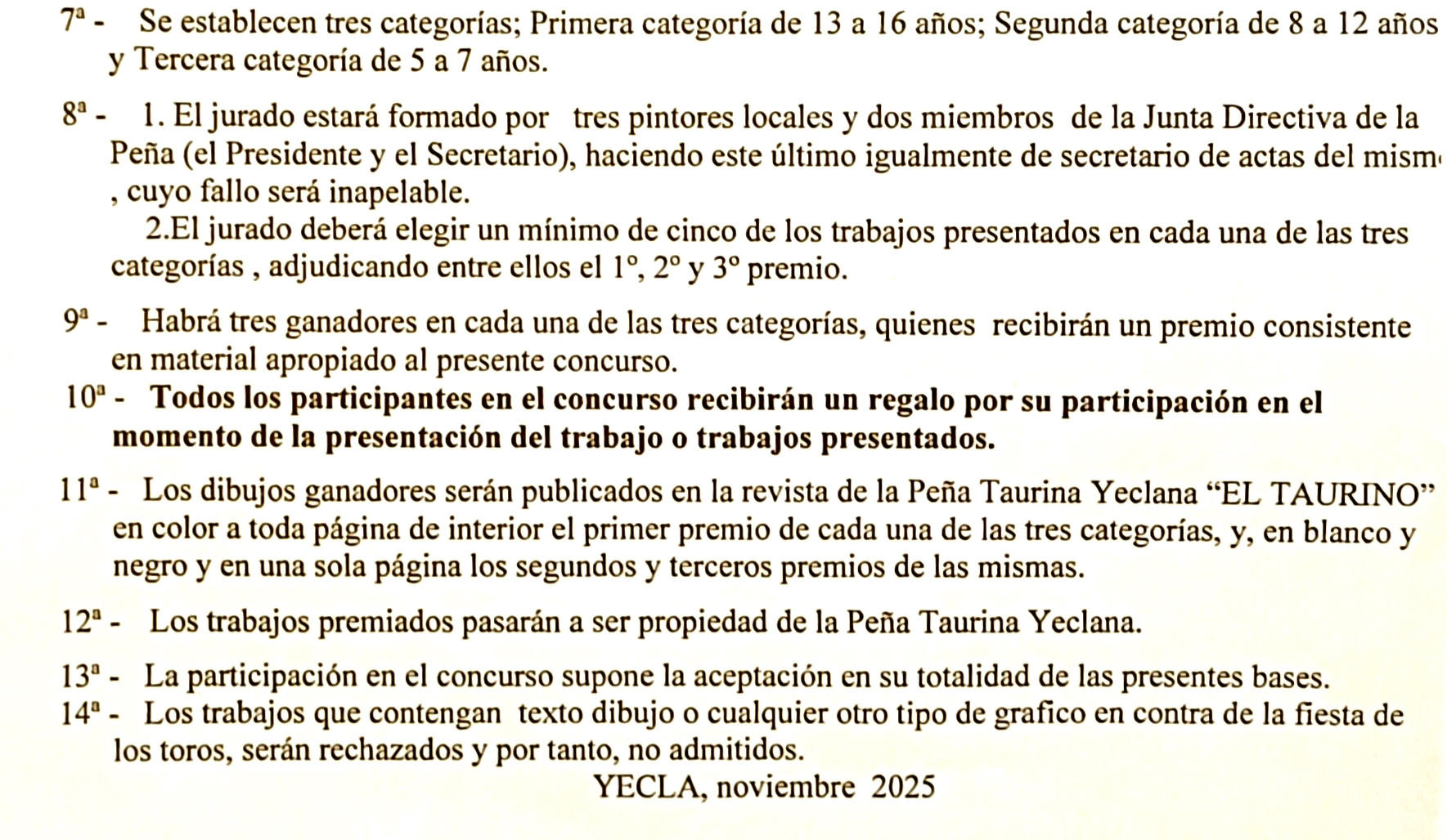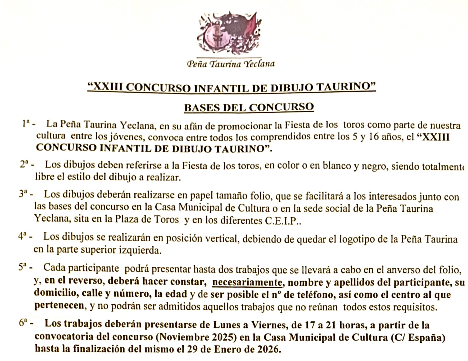 La Peña Taurina Yeclana convoca el «XXIII Concurso Infantil de Dibujo Taurino» entre alumnos de los Institutos y Colegios de Yecla.