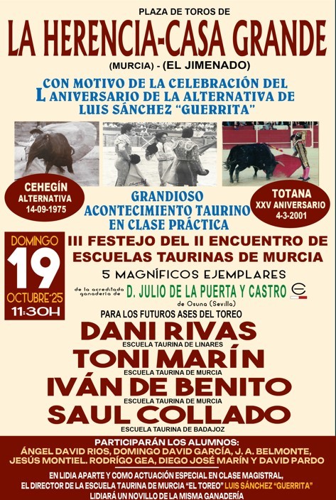 Como colofón y en un apartado especial dentro del festejo, se contará con la actuación magistral del presidente de la Escuela Taurina de Murcia y profesor de la misma, D. Luis Sánchez “Guerrita”, quien, en un gesto cargado de simbolismo y afición, conmemorará el 50 aniversario de su alternativa toreando un novillo de la misma ganadería en una clase magistral de toreo.