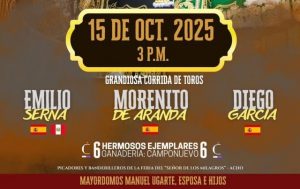 Ante estas previsiones tan adversas y mirando por la seguridad de todos los aficionados, la empresa y el Ayuntamiento se ven obligados a cancelar este festejo en el que estaban anunciados los matadores de toros Emilio Serna, Antonio Puerta y Filiberto y los novilleros sin picadores Salvador Ruiz ‘El Marqués’ y Jesús Montiel, con ganado del Marqués de Domecq y Dámaso González.
