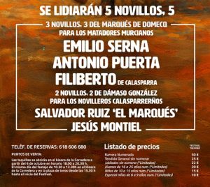 Actuaran: Toni Marin (E.T. de Murcia) – Hugo Reinosa (E.T. Alcazar de San Juan) – Ivan Benito (E.T. Ubeda) – y Antonio Arias (E.T. Malaga). Lidiaran novillos de Julio de la Puerta. Habrá dos vaquillas de Alvalle para alumnos aventajados.