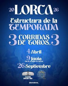 La temporada taurina en la Ciudad del Sol se abrirá el 4 de abril, Sábado de Gloria; Una fecha ya tradicional, en plena Semana Santa Lorquina; La segunda fecha taurina en Lorca será el 9 de junio, festividad de la Región de Murcia, una cita que convertirá Lorca en el epicentro taurino de la Región y de provincias limítrofes. Y para cerrar la programación, el 26 de septiembre se celebrará la Corrida de Feria que en esta ocasión trae como novedad que se celebrará el segundo Domingo de Feria en lugar del primero como ha venido sucediendo estos dos últimos años.