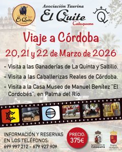 El viaje será a Córdoba, durante los días 20, 21 y 22 de Marzo, se visitarán las emblemáticas ganaderías de La Quinta (procedencia Santa Coloma) donde veremos la corrida apartada para Sevilla, las dos que tiene para Madrid y para el resto de plazas, y Saltillo (procedencia Saltillo) donde también se verá la espectacular corrida reseñada para Madrid y otras plazas de Francia, así como toda de la camada.
