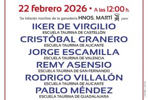 ALICANTE. Miercoles 18 de febrero de 2026 – Informa: José Maria Jericó. La empresa Eventos Mare Nostrum, en colaboración con el Ayuntamiento de Alicante, anuncia para el próximo domingo, 22 de febrero, a las 12,00 h., el «V Certamen José María Manzanares», para novilleros sin picadores, este certamen se realiza con entrada gratuita y puertas abiertas al público en general.