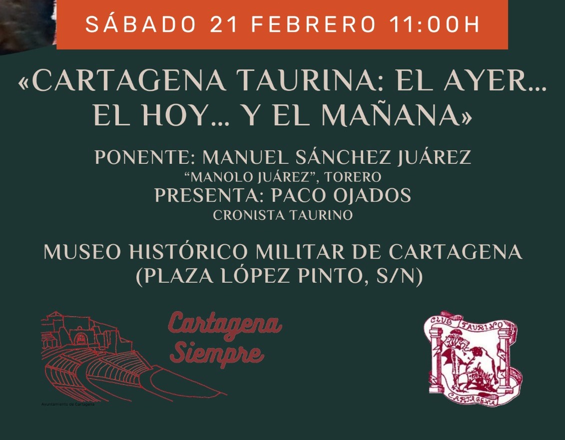 CARTAGENA (Murcia). Martes 17 de febrero de 2026 – NdP – El próximo 21 de febrero a las 11:00 horas, te invitamos al Museo Histórico Militar de Cartagena (Plaza López Pinto, s/n) a una gran conferencia-coloquio sobre la historia y el futuro de nuestra tradición taurina.
