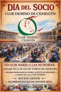 El Club Taurino de Cehegín celebrará el próximo día Domingo 15 de marzo de 2026 en la Centenaria Plaza de Toros su tradicional y anual Día del Soci@.