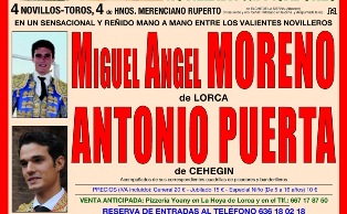 En el cartel se anuncian cuatro novillos de la ganadería de Hermanos Merenciano Ruperto para los novilleros Miguel Ángel Moreno (de Lorca) y Antonio Puerta (de Cehegín), que actuarán mano a mano.