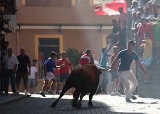 MORATALLA (Murcia). Sábado, 14 Julio 2012. Texto y Fotos.- Enrique Soler. Complicada y peligrosa suelta protagonizaron en la tarde de ayer en Moratalla, los astados de la ganadería de los Hermanos Gregorio Garzón, acompañados por cabestros de Casa Nueva. La manada partió desde la plaza del Nazareno hasta ascender a lo alto de la población, los cabestros iniciaron la carrera acompañados únicamente de un novillo,quedando el resto a su libre juego por el recorrido oficial. Otros dos astados realizaron la carrera en pareja cruzando de un lado al otro de las tablas, pero el último que ascendió solo provocó los momentos de mayor tensión intentando embestir a todo aquel que se cruzaba en su camino. La suelta se saldó con un herido por asta de toro en la zona de la Farola, un despiste hizo que el varón de unos 45 años de edad y natural de Caravaca, estuviera pendiente de un toro, sin ver que por la espalda subía el último de la manada, tras ser atendido por el equipo quirúrgico en el Centro de Salud de Moratalla, fue dado de alta con varios puntazos en el cuerpo.