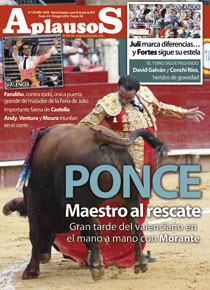 REMITIDO POR REDACCION DE APLAUSOS. La Feria de Julio de Valencia y la Feria de Santiago de Santander protagonizan gran parte del nuevo número de la Revista APLAUSOS. Ambos ciclos, recién concluidos, se analizan al detalle tanto crónica como gráficamente en las páginas del semanario taurino. El ciclo valenciano contó con nombres propios como Enrique Ponce, Iván Fandiño y Sebastián Castella mientras que en el coso de Cuatro Caminos, El Juli y Jiménez Fortes marcaron diferencias. En el aspecto ganadero destacó una gran corrida de Victorino Martín.