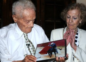 Cano que estaba acompañado por Maruja su mujer, y su hijo mayor Vicente, de 80 años, expreso su felicidad y emoción al poder recibir a sus casi 102 años este emotivo homenaje rodeado de tantos amigos, entre los que tambiénse encontraban la periodista Nieves Herrero, El Soro y el Diputado de Asuntos Taurinos de Valencia, Isidro Prieto, entre otros.