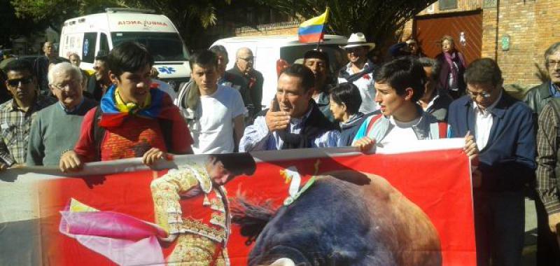 Publicado en APLAUSOS.es Cerca de 1.000 personas se congregaron en los aledaños de la plaza de toros Santamaría de Bogotá para clamar por la libertad y por la Fiesta de los Toros en esta ciudad. Con las notas del himno nacional de Colombia y un pasodoble se inició un acto encabezado por el matador de toros César Rincón que hizo un llamamiento a toda la afición taurina para apoyar a los ocho novilleros que se encuentran en huelga de hambre.