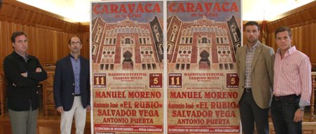 CARAVACA DE LA CRUZ (Murcia). Viernes, 26 Septiembre 2014.Redacción. El sábado 11 de octubre a las 17.00 horas, la Plaza de Toros de Caravaca de la Cruz, acogerá un Festival Taurino Mixto, con novillos de la ganadería de Don Apolinar Soriano Heras. El cartel lo componen el rejoneador Manuel Moreno, los matadores de toros Antonio José López “El Rubio” y Salvador Vega, y el novillero con caballos Antonio Puerta. Dentro de este festival, tendrá lugar el II Concurso de Recortadores, con la participación de diversas peñas integrantes del bando de los Caballos del Vino. Por otra parte, antes de la celebración de dicho festival, tendrán lugar las VI Jornadas Taurinas, moderadas por María José Barrera. El jueves, 9 de octubre, a las 21.00 horas en la antigua iglesia de la Compañía de Jesús se presentará el libro “Como un ciprés, Manolete”, de Pedro Ballester Lorca, y el sábado, 11 de octubre, a las 13.00 horas se celebrarán “Los Aperitivos Taurinos” en la carpa que se instalará en Gran Vía, con la participación de los toreros y novilleros que forman parte del cartel del festival, ganaderos, prensa taurina y aficionados. Festival y Jornadas han sido presentados hoy en el Salón de Plenos del Ayuntamiento de Caravaca de la Cruz, con la presencia del concejal de Festejos, José Francisco García; el empresario Jesús Medrano; el torero Antonio José López “El Rubio” y Jorge Cuadra Soriano, éste último en representación de la familia ganadera Soriano.