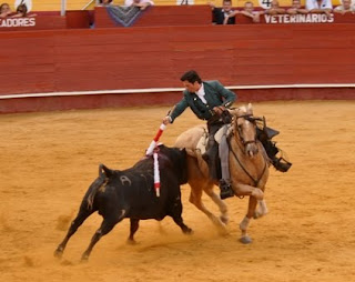 Tarde con riesgos de sufrir »golpes de calor». Muchos seguidores de El Cartagenero en la Plaza de Almería, en autobus fletado por el Club Taurino de Cartagena y en coches particulares. La feria almeriense –Virgen del Mar- empieza como termina la nuestra de Murcia, con una de rejones. El Cartel para los que siguen -seguimos- a »El Cartagenero» tenía muchos alicientes y una preocupación, ver las evoluciones de Pedro en el ruedo, sabiendo las muchas dificultades que tenía por las limitaciones fisicas de su maltrecho pie, cuatro fracturas; y aunque reapareció con éxito en Villanueva del Rio Segura, se vio obligado a perder el siguiente festejo por prescripción médica. El Cartagenero pudo y debió salir a hombros, aunque se vio muy condicionado por la lesión. Sus dos actuaciones tuvieron mucho mérito exhibiendo, como siempre, su excelentes condiciones y su magnifica cuadra de caballos. La faena en su primero fue de menos a más con un toro exigente. Calentó los tendidos, especialmente, con Marfil, en lances vibrantes de intensidad y ajustes, rematando con adornos de espectaculares piruetas. Pudo cortar la oreja, pero el astado tardó en doblar, debió coger el descabello y jugarsela, al final la perdió por no hacerlo. Enfrió el momento, pero la oreja se le pidio con fuerza. Saludos desde del tercio. En el segundo tuvo una faena más completa, pero que se vio empañada por las intermitencias y excesiva presencia en el ruedo del subalterno Parrita que bregó en solitario demasiado. El honrado y disciplinado Parrita no hizó otra cosa que cumplir ordenes, pero se llevó las injustas pitadas del respetable. Tras el rejón de muerte precisó de dos descabellos. La peticición de oreja fue muy fuerte y justo le fuera otorgada la oreja que paseó.