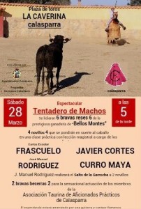 El acontecimiento tendrá lugar el Domingo 28 de marzo a las 17 h en la Plaza de toros de Calasparra. Agradecer al fotógrafo local Raspa, por cedernos la imagen del cartel. También se realizará la suerte del salto de la garrocha en dos novillos, y la faena de muleta estará amenizada por el cantaor local, José Antonio Gil «El Pólvora» acompañado por un guitarrista.